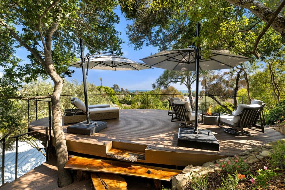 The home offers 4 bedrooms, 4 bathrooms, 2 kitchens (one on each floor) and a gorgeous deck with ocean view and view of Coast Village Road.